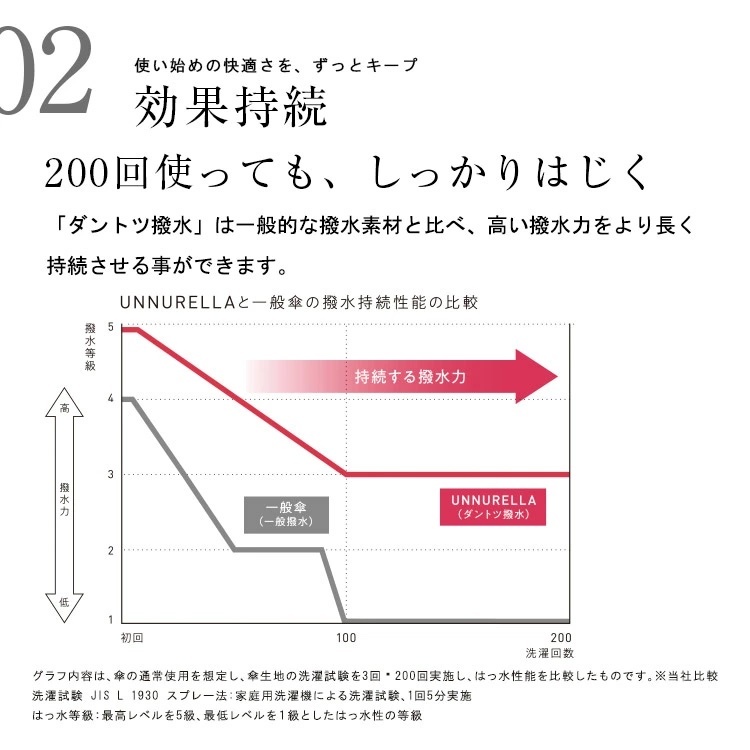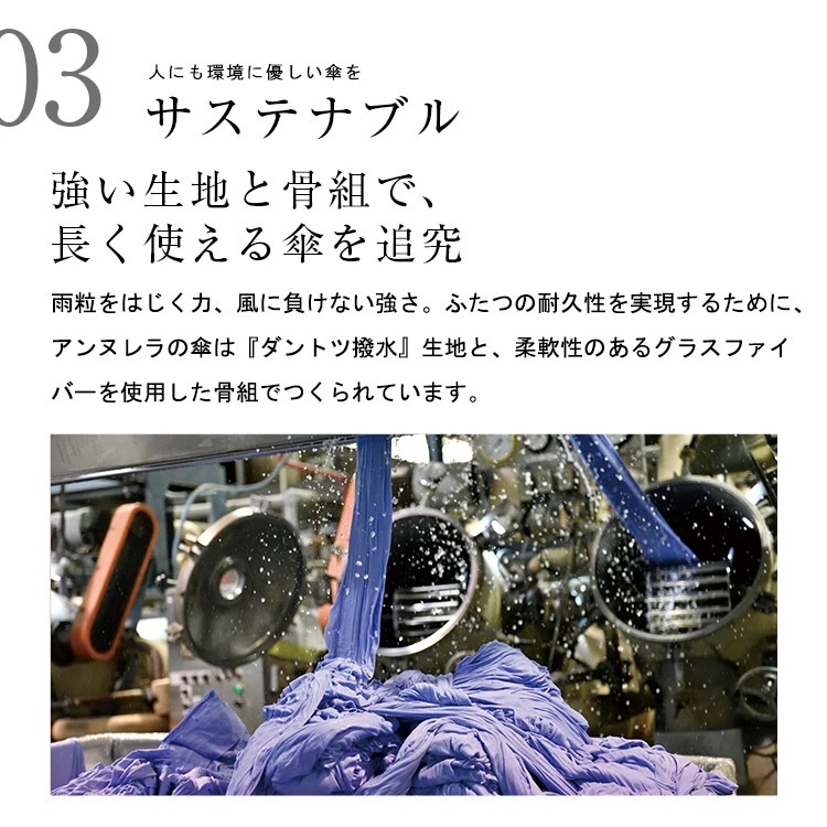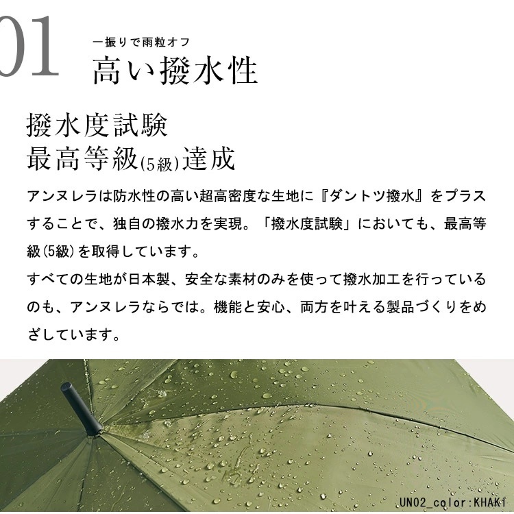 By combining high-density fiber jointly developed with Komatsu Matere Co., Ltd., a world-renowned Japanese fabric manufacturer, and the cutting-edge water-repellent treatment "Dantotsu Water Repellent" developed by the company, which boasts high technological capabilities, Achieves unparalleled durability and water repellency of the highest grade. We have created an umbrella for adults that can be used for a long time while being taken care of.