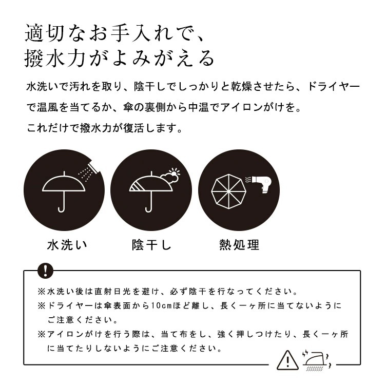 In general, water repellency gradually becomes less effective in daily life. This is caused by raindrops, dust in the air, and hand oils and hand creams that stick to the umbrella when wrapped, remaining on the surface of the fabric.